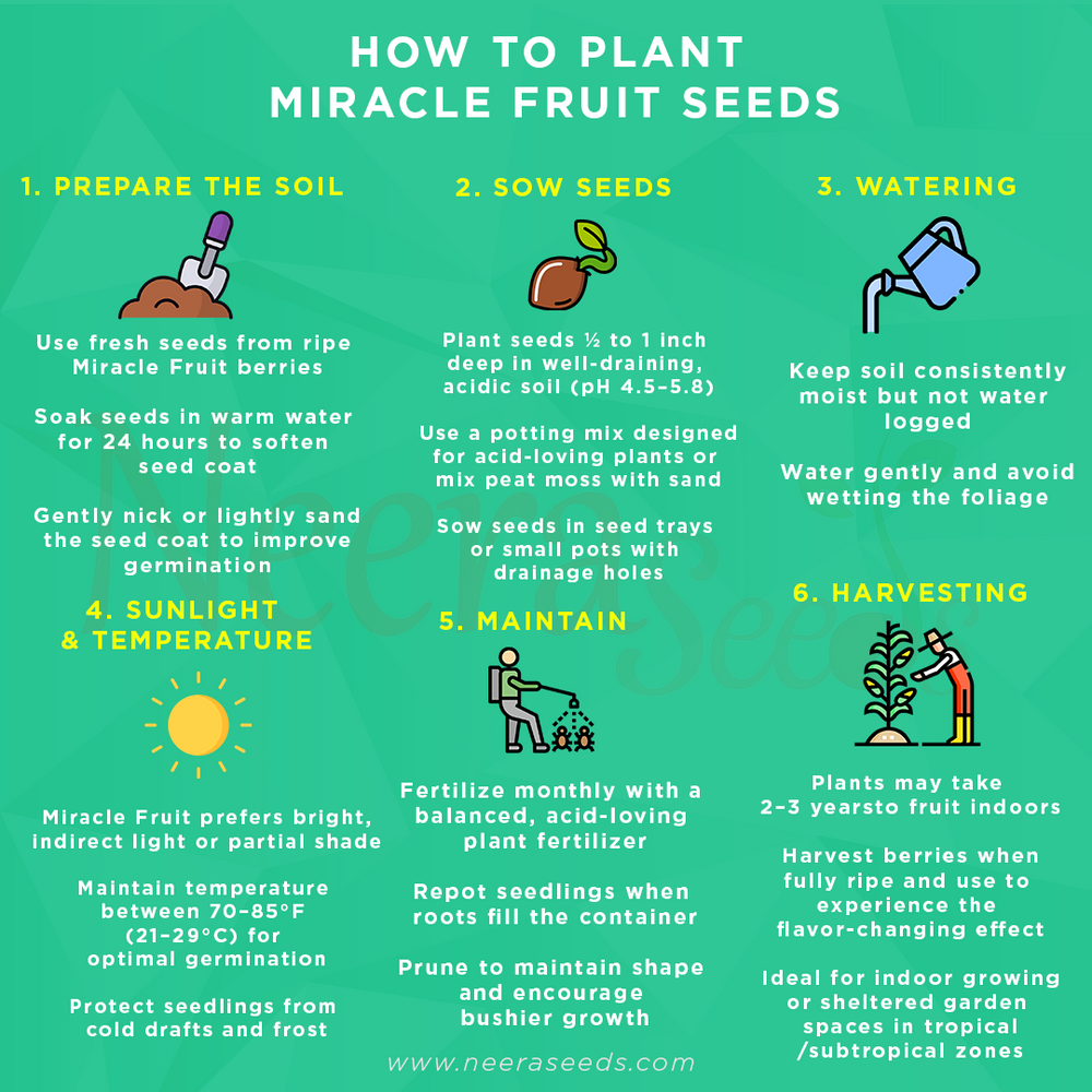 Planting Instructions: Sow Miracle Fruit Seeds for planting in well-draining, acidic soil. Heirloom seeds ensure authentic flavor-changing berry growth.