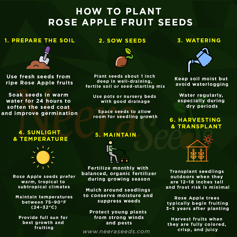 Planting Instructions: Sow Rose Apple Fruit Seeds for planting in well-draining soil, ½–1 inch deep. Heirloom seeds ensure authentic tree growth.