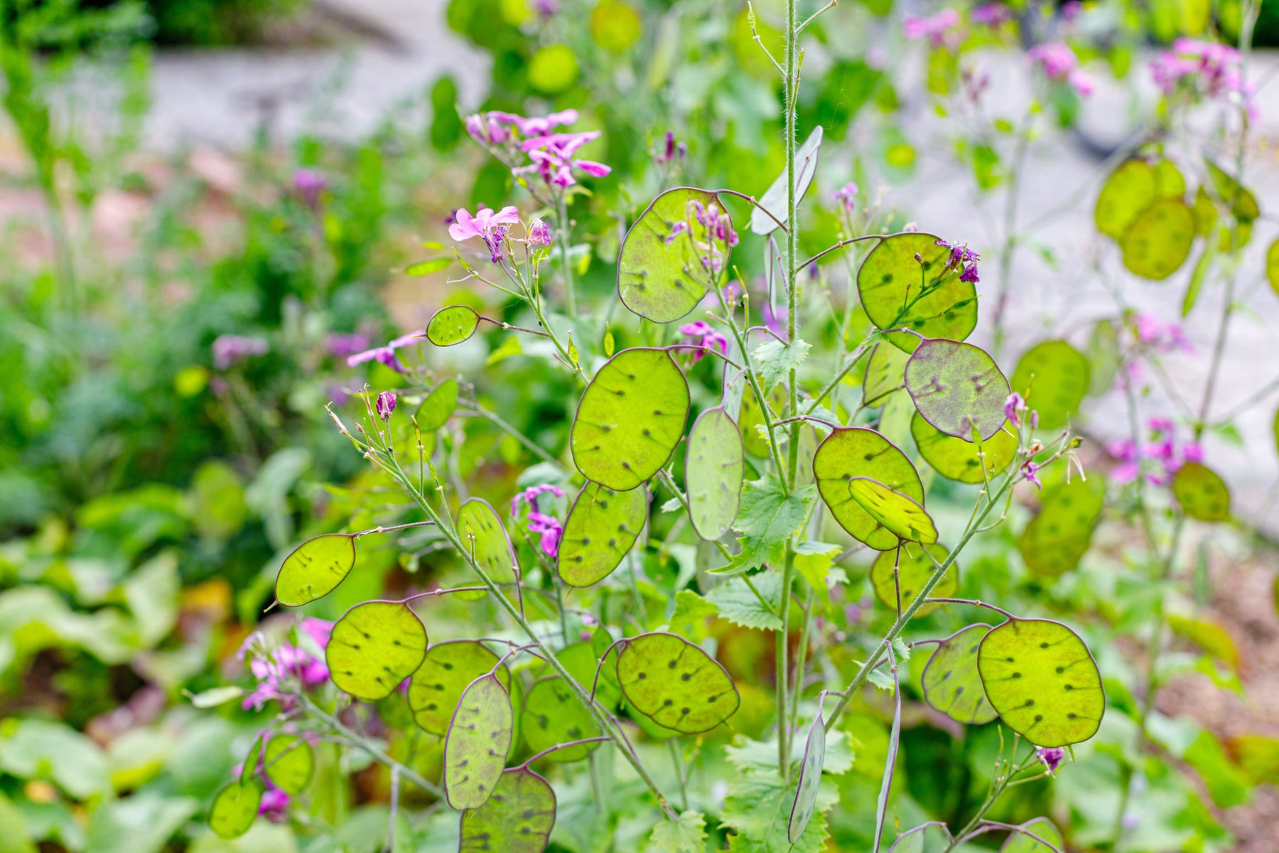 Water regularly but avoid overwatering to support healthy violet blooms and decorative seed pods.
