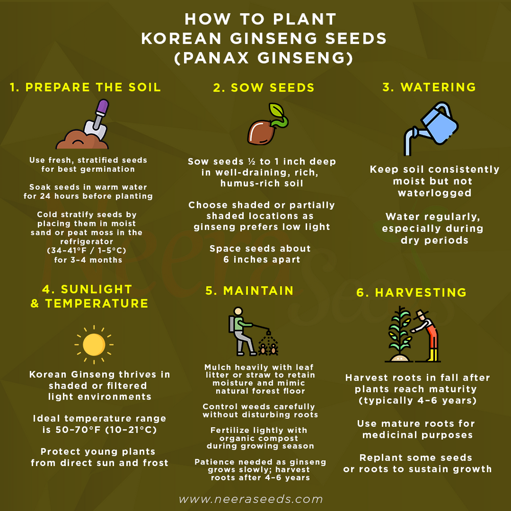 Ginseng seeds require cold stratification. Sow outdoors in fall or stratify in the refrigerator for 4–6 months before spring sowing.